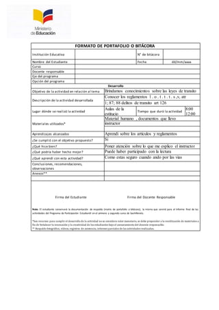 El documento contiene 10 formatos de bitácora para registrar las actividades de educación vial realizadas por estudiantes. Cada formato incluye información como el objetivo de la actividad, la descripción, lugar, materiales utilizados y aprendizajes logrados. Los temas cubiertos incluyen instrucción formal, leyes de tránsito, seguridad vial y presentaciones sobre señalizaciones.