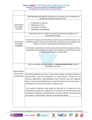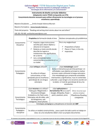 Este documento presenta un instrumento de diseño curricular didáctico adaptado de la matriz TPACK enriquecida con CTS para el proyecto "Reading and writing short stories about me and others" impartido por la maestra Emilia Eneyda Valencia Murraín. El resumen incluye los conocimientos disciplinares, pedagógicos, tecnológicos y pedagógico-disciplinares; las estrategias, recursos y herramientas TIC a emplear; y los procesos de evaluación y oportunidades de aprendizaje diferenciadas.