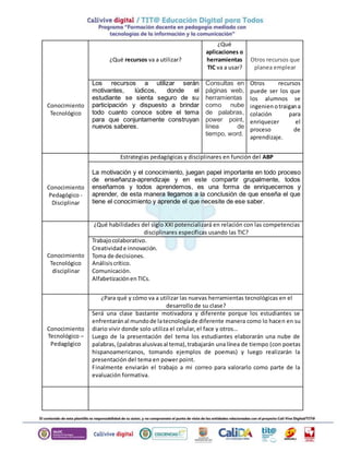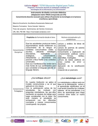 Este documento presenta la matriz TPACK enriquecida con CTS que será utilizada por la maestra Ana Marina Bustamante para desarrollar su proyecto sobre los sentimientos del hombre americano. La matriz describe los conocimientos disciplinares, pedagógicos, tecnológicos, pedagógico-disciplinares y pedagógico-tecnológicos que la maestra utilizará, así como las estrategias, recursos, habilidades del siglo XXI y procesos de evaluación formativa a implementar.