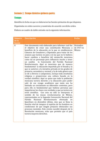 Este documento presenta 18 fuentes primarias ordenadas cronológicamente desde 1917 hasta 1937 relacionadas con la educación en México. Cada fuente incluye una breve descripción, fecha y lugar. El documento provee información valiosa sobre la evolución del sistema educativo mexicano y personas clave como Lázaro Cárdenas.