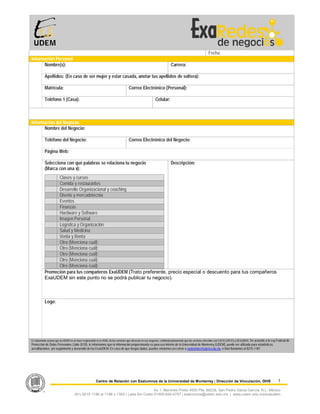El documento solicita información personal y de negocios para su inclusión en una base de datos de la Universidad de Monterrey. La información recopilada se usará con fines internos, como estadísticas y seguimiento, y se advierte que la universidad no avala los servicios ofrecidos. También se incluye información de contacto para consultas y recordatorios sobre la protección de datos personales.