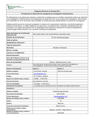 Este documento presenta un formato para desarrollar una pregunta de investigación como parte del Programa Ciencia en la Escuela 2013. El formato solicita información general sobre la institución educativa, los maestros y estudiantes participantes, así como detalles sobre el título, área temática, categoría, modalidad y palabras clave del anteproyecto. También pide que se incluyan preguntas iniciales, la pregunta de investigación seleccionada, una justificación, antecedentes, objetivos, metodología y detalles sobre la presentación del proyecto