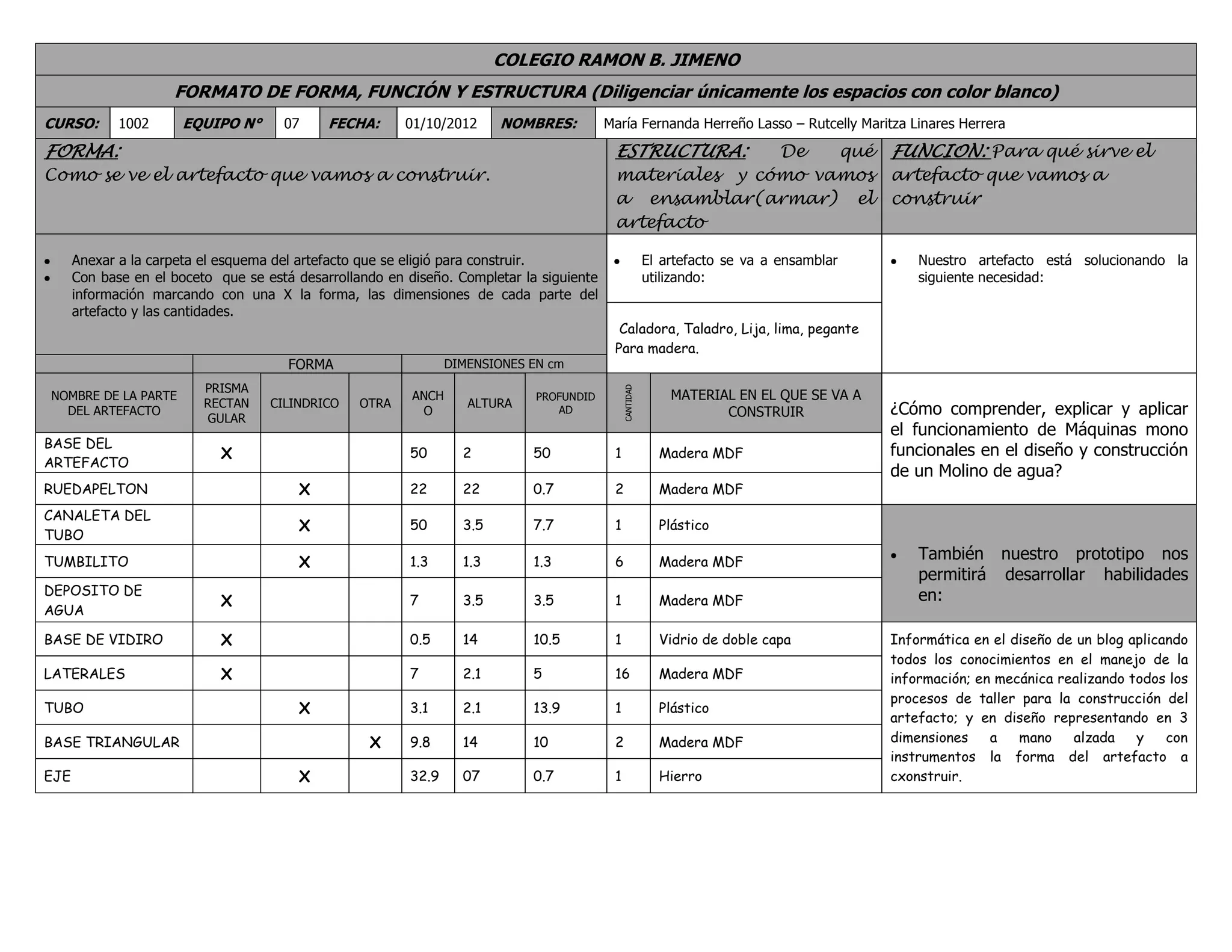 El documento proporciona información sobre la forma, estructura y función de un artefacto que dos estudiantes van a construir. La forma del artefacto incluye una base rectangular de madera MDF de 50x2x50 cm, ruedas cilíndricas de madera MDF de 22x22x0.7 cm, y una canasta cilíndrica de plástico de 50x3.5x7.7 cm. Se ensamblará usando herramientas como taladro y pegante para madera. Su función será comprender el funcionamiento de máquinas monofuncional