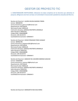 El documento presenta información detallada sobre un proyecto educativo TIC en la Institución Educativa Gonzalo Restrepo Jaramillo en Medellín, que involucra a varios docentes en la implementación de secuencias didácticas para mejorar la enseñanza de química. Se describe la caracterización institucional, diagnóstico inicial de recursos utilizados, así como la metodología propuesta y los objetivos del proyecto enfocados en el uso de tecnología para mejorar el aprendizaje y la motivación en el área de química. Además, se abordan aspectos del contexto sociocultural del municipio y el diagnóstico de las competencias de los estudiantes para fundamentar el proyecto.