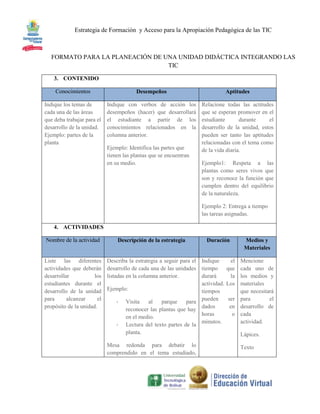 Este documento presenta un formato para planear una unidad didáctica integrando las TIC con 6 secciones. La primera sección recopila datos de identificación como el nombre de la unidad, grupo, áreas e integradas y duración. La segunda sección detalla los aspectos pedagógicos incluyendo competencias, indicadores de logro y preguntas guías. La tercera sección presenta el contenido con conocimientos, desempeños y aptitudes. La cuarta sección enumera las actividades con su descripción, duración y materiales. La quinta sección