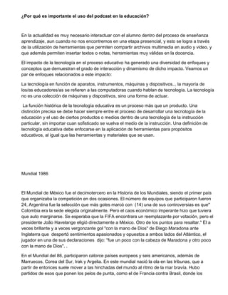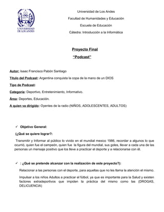 El documento presenta un proyecto de podcast sobre el Mundial de Fútbol de 1986 realizado en México. El podcast tiene como objetivo principal informar y recordar a los oyentes sobre lo ocurrido en el mundial de 1986, en el que Argentina se consagró campeón de la mano de Diego Maradona. El podcast detalla aspectos clave del mundial como los goles de Maradona frente a Inglaterra, conocidos como "La mano de Dios" y el mejor gol del siglo. Finalmente, el documento incluye un guion técnico-literario del podcast