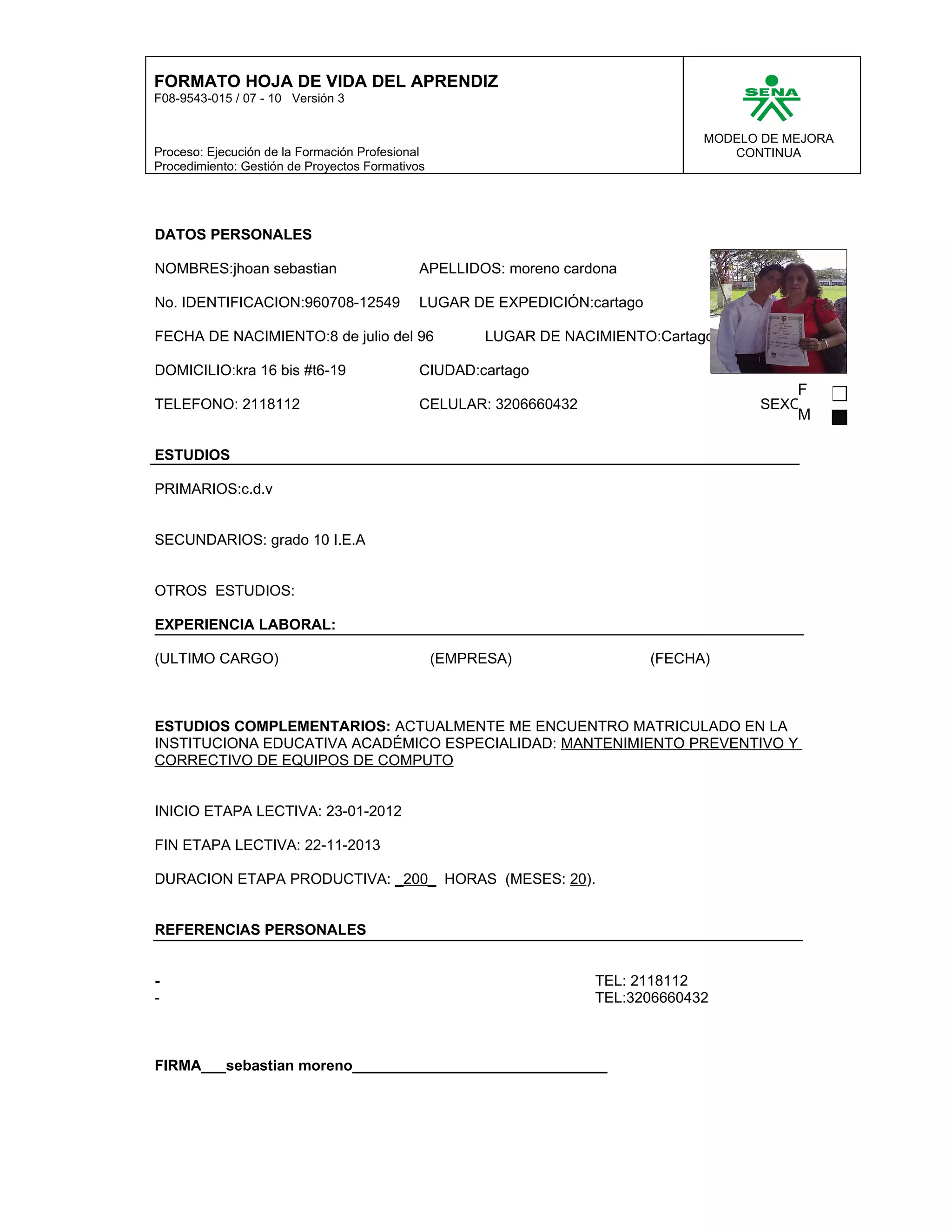 Este documento presenta un formato de hoja de vida para un aprendiz que incluye secciones para datos personales, estudios, experiencia laboral, estudios complementarios actuales y referencias personales. Proporciona información como nombre, identificación, fecha de nacimiento, domicilio, teléfonos, estudios primarios y secundarios, detalles del programa de formación profesional actual en el que está matriculado incluyendo fechas de inicio y fin así como la duración en horas de la etapa productiva.