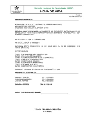 Este perfil profesional presenta a Yeison Delgado Carreño, un hombre colombiano nacido en 1984 en Bucaramanga. Actualmente cursa una especialización en Administración de Empresas Agropecuarias en el SENA. Cuenta con experiencia laboral en fotocopiado, mensajería y como cajero. Ha tomado varios cursos de administración, finanzas, construcción, ofimática y liderazgo. Presenta referencias personales para contacto.