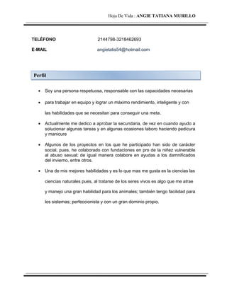 Angie Tatiana Murillo es una mujer soltera de 25 años que vive en Cartago, Colombia. Actualmente está terminando la secundaria y ocasionalmente trabaja haciendo manicura y pedicura. Sus habilidades incluyen ciencias naturales y trabajo en equipo. Su hoja de vida proporciona detalles sobre su educación, experiencia laboral y referencias.