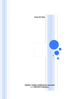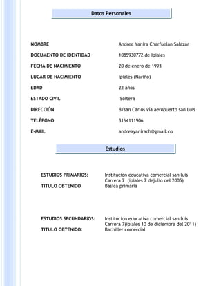 Este documento es la hoja de vida de Andrea Yanira Charfuelan Salazar. Presenta su información personal, incluyendo su nombre, documento de identidad, fecha y lugar de nacimiento, edad, estado civil y contacto. También detalla sus estudios primarios, secundarios y otros cursos. Finalmente, enumera su experiencia laboral en diferentes cargos y empresas, así como sus referencias familiares y personales.