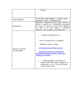 Este documento describe un proyecto escolar sobre el Romanticismo Literario y la novela "María" de Jorge Isaacs. El objetivo es que los estudiantes creen una presentación de 4 minutos en PowerPoint o Slideshare que explique el concepto de Romanticismo, sus características y ejemplos en la novela, luego de visitar la Hacienda El Paraíso donde se desarrolla la historia. El documento detalla los elementos, resultados esperados, datos e información disponible, y procesos necesarios para resolver el problema planteado.