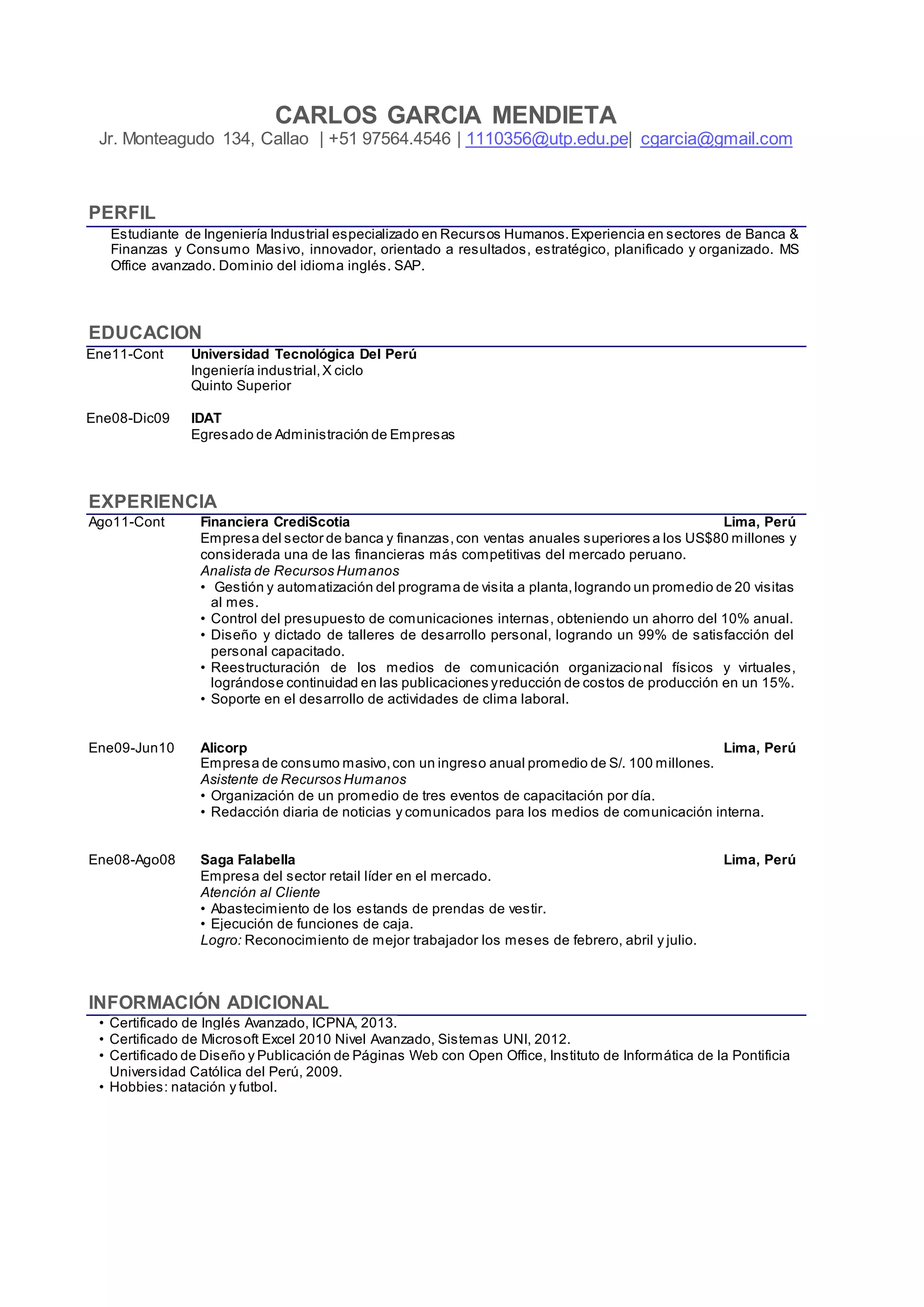 Carlos García Mendieta es un estudiante de ingeniería industrial especializado en recursos humanos con experiencia en banca, finanzas y consumo masivo. Actualmente estudia en la Universidad Tecnológica del Perú y ha trabajado como analista de recursos humanos en Financiera CrediScotia y como asistente de recursos humanos en Alicorp. Sus habilidades incluyen gestión de recursos humanos, comunicaciones internas, capacitación y desarrollo del personal.