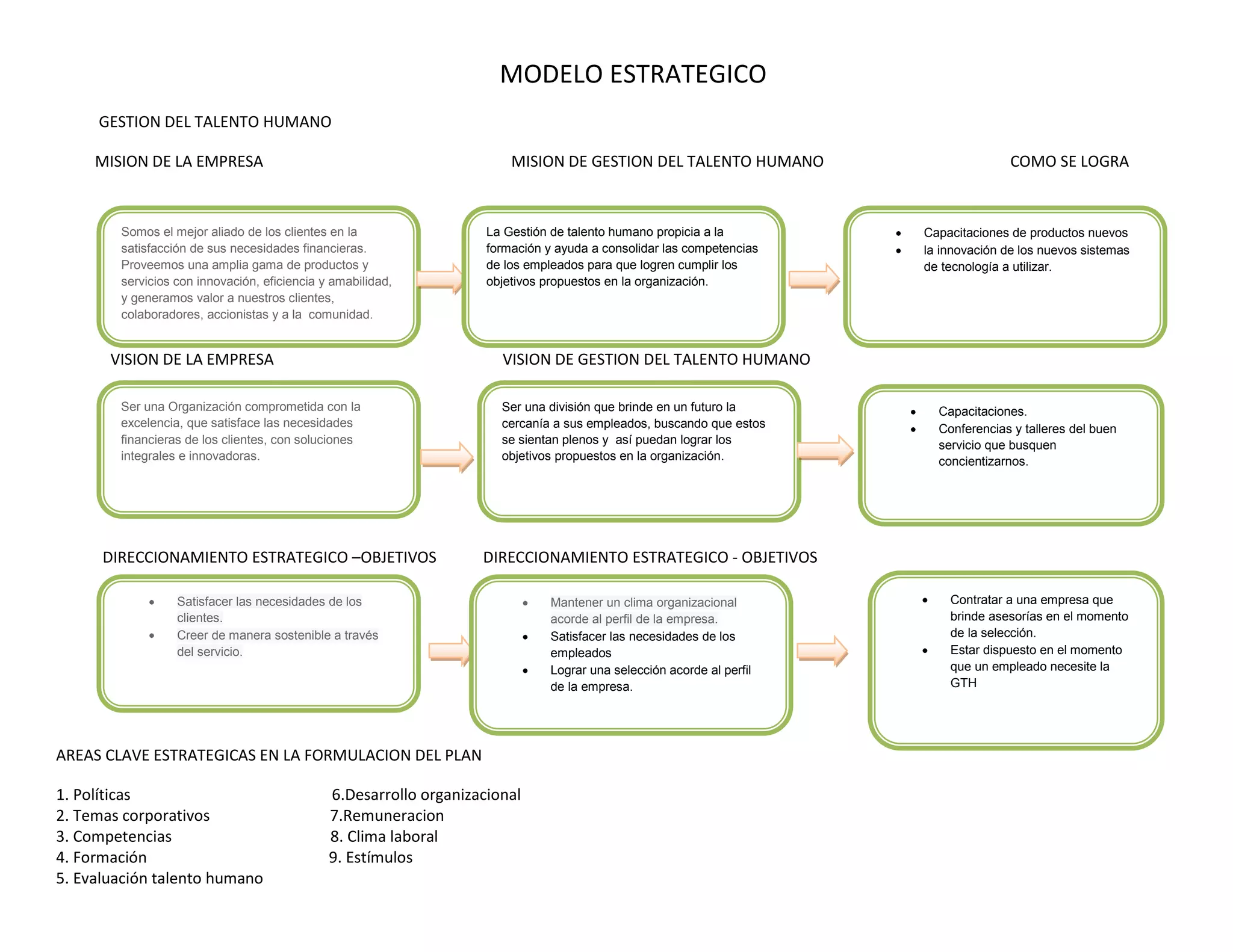 La gestión del talento humano tiene como misión propiciar la formación y consolidar las competencias de los empleados para que cumplan los objetivos de la organización. Sus áreas clave estratégicas incluyen políticas, competencias, formación, evaluación del talento humano, desarrollo organizacional, remuneración, clima laboral y estímulos. Sus estrategias se enfocan en el desarrollo de capacitaciones, evaluaciones periódicas y la creación de un ambiente laboral integrador.