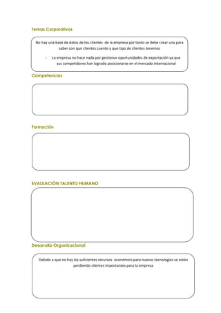 El documento presenta el plan estratégico de gestión de talento humano de una empresa. Su misión es proporcionar un buen ambiente laboral y su visión es ser reconocida internacionalmente por el bienestar de sus empleados. El plan identifica áreas clave como políticas, formación y remuneración. Luego realiza un diagnóstico encontrando deficiencias en uniformidad, base de datos de clientes y ajuste salarial. Finalmente propone objetivos, estrategias y acciones para mejorar en estas áreas.