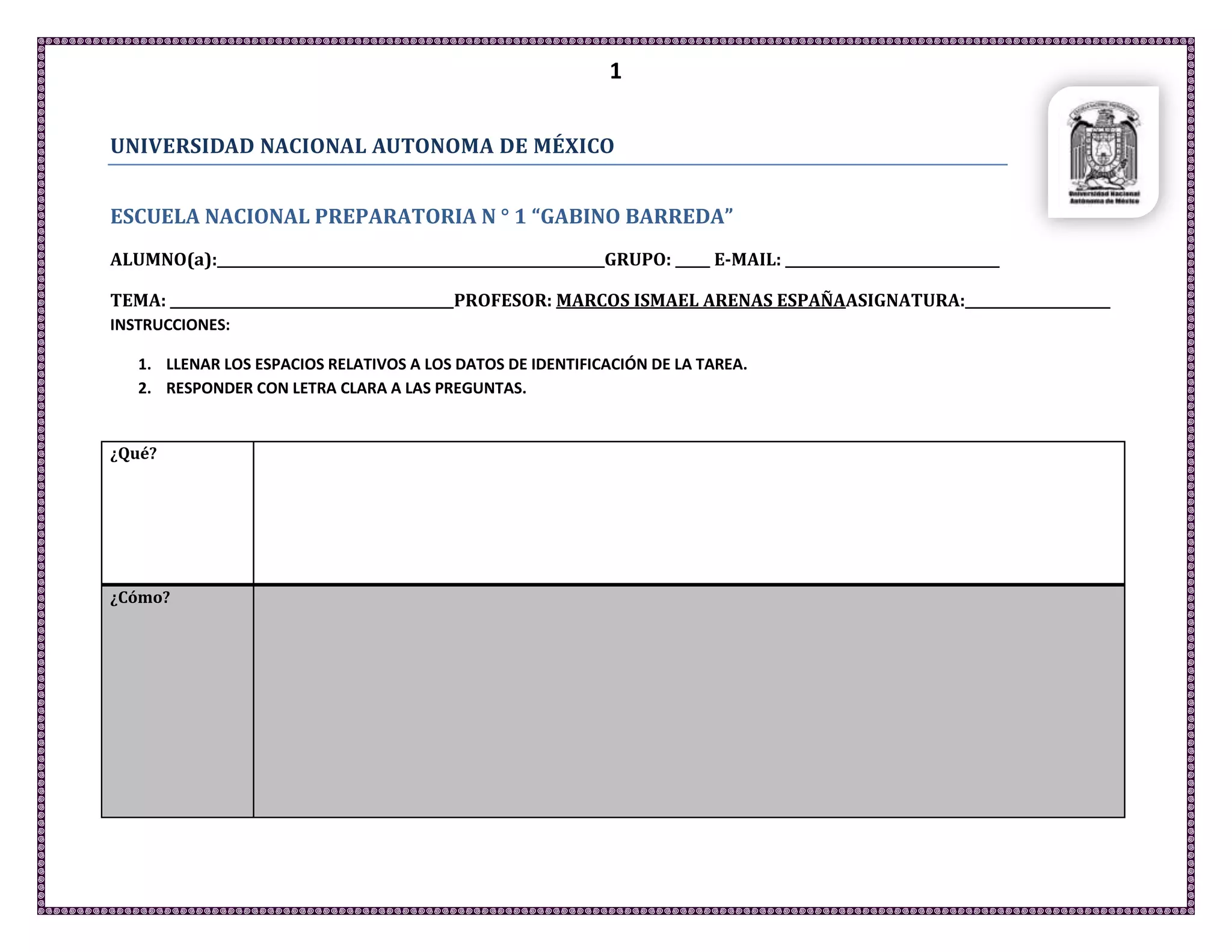 Este documento contiene instrucciones para completar una tarea escolar. Pide al estudiante que provea su nombre, grupo, correo electrónico, tema de la tarea, nombre del profesor y asignatura. Además, incluye secciones para responder preguntas sobre qué, cómo, cuándo, dónde, por qué y quiénes en relación al tema asignado.