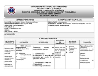 El plan de clase tiene como objetivo que los estudiantes conozcan y apliquen la estrategia didáctica del aula invertida mediante el uso de herramientas TIC. La clase introducirá el concepto de aula invertida, sus ventajas y desventajas. Luego, los estudiantes interactuarán a través de la aplicación Nearpod para desarrollar la práctica propuesta y evaluar sus conocimientos previos a través de un cuestionario. El resultado esperado es que los estudiantes integren las TIC en el desarrollo de pr