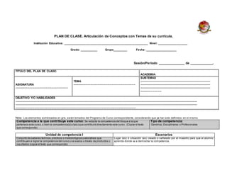 Este documento presenta un formato para que los docentes elaboren un plan de clase articulando conceptos con temas de su currícula. El plan incluye el título, asignatura, tema, subtemas, objetivos, actividades de aprendizaje, mediación, recursos, y estrategia de evaluación. Los docentes deben enviar el plan de clase completado antes de la fecha límite indicada para recibir comentarios que ayuden a mejorar su enseñanza.
