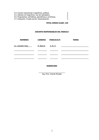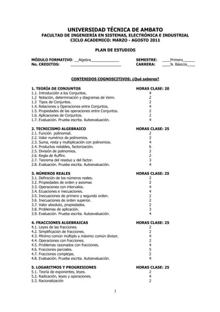 Este documento presenta el plan de estudios de un módulo de álgebra en la Facultad de Ingeniería de una universidad técnica. El módulo se imparte en el primer semestre de la carrera de N. Básicos y consta de 5 contenidos cognoscitivos con un total de 120 horas de clase: 1) Teoría de conjuntos (20 horas), 2) Técnicas algebraicas (25 horas), 3) Números reales (25 horas), 4) Fracciones algebraicas (25 horas), y 5) Logaritmos y progresiones (25 horas
