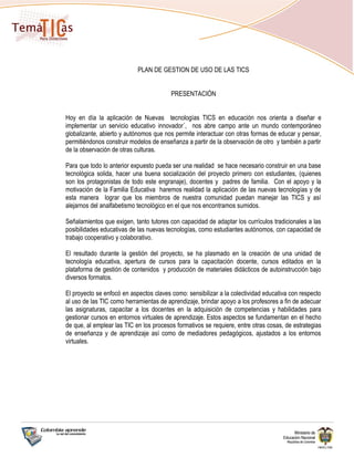 El plan de gestión de uso de las TIC de la Institución Educativa Técnica Alfonso López Pumarejo propone conformar un equipo de gestión para promover la utilización de las herramientas tecnológicas en la comunidad educativa, actualizar el plan de estudios incorporando las TIC, y capacitar a los docentes en el uso pedagógico de las nuevas tecnologías.