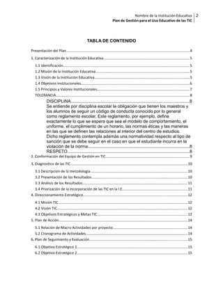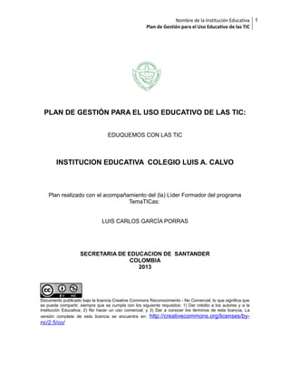 Este documento presenta el Plan de Gestión para el Uso Educativo de las TIC del Colegio Luis A. Calvo. El plan caracteriza la institución, conforma un equipo de gestión TIC, realiza un diagnóstico de las TIC existentes, establece una dirección estratégica con misión, visión y objetivos TIC, y presenta planes de acción, seguimiento y socialización para mejorar el uso educativo de las TIC en la institución. El rector expresa su apoyo a incorporar las TIC en la gestión escolar para facilitar el