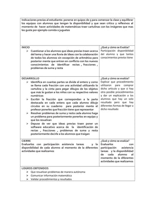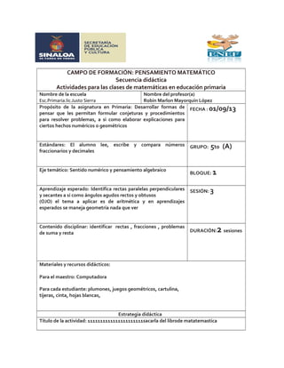 Este documento presenta una secuencia didáctica para enseñar matemáticas en primaria. La secuencia se centra en identificar rectas, fracciones y problemas de suma y resta. Incluye actividades como identificar fracciones usando cartulinas y círculos, resolver problemas matemáticos en equipos y usar software educativo. La secuencia evalúa la participación de los estudiantes, su disponibilidad y comprensión de los conceptos matemáticos cubiertos.