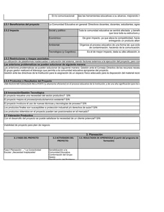 Este documento presenta un proyecto para mejorar la conectividad escolar en la Institución Educativa Julio César García en Antioquia, Colombia. El proyecto busca utilizar herramientas educativas de las TIC para establecer una red de videoconferencia que mejore el proceso educativo. Los objetivos incluyen desarrollar subproyectos en diferentes áreas utilizando la conectividad para interactuar con pares de otras instituciones y crear ambientes de aprendizaje. El proyecto beneficiaría a la comunidad educ