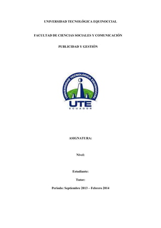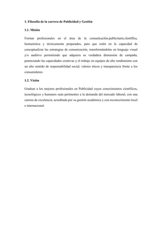 Este documento presenta la filosofía y objetivos de la carrera de Publicidad y Gestión de la Universidad Tecnológica Equinoccial. Su misión es formar profesionales capaces de conceptualizar estrategias de comunicación utilizando lenguaje visual y auditivo, con valores éticos y responsabilidad social. Su visión es graduar a los mejores profesionales en publicidad, reconocidos a nivel local e internacional por sus conocimientos científicos, tecnológicos y humanos pertinentes a las demandas del mercado laboral.