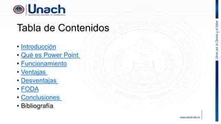 Este documento proporciona una introducción a PowerPoint, incluyendo una descripción de sus funciones principales, ventajas y desventajas. Explica que PowerPoint es una herramienta de Office que permite crear presentaciones visuales y atractivas de manera fácil y rápida, con plantillas prediseñadas o personalizadas. Entre sus ventajas se encuentran una amplia gama de diseños, la capacidad de coordinar texto, imágenes y videos, e incluir hipervínculos. Sus desventajas incluyen el riesgo de robo