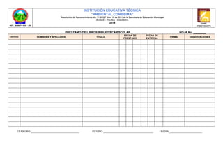 Este documento es una hoja de préstamo de libros de la biblioteca escolar de la Institución Educativa Técnica “Ambiental Combeima” en Ibagué, Colombia. La hoja incluye espacios para registrar la cantidad de libros prestados, los nombres y apellidos del prestatario, los títulos de los libros, las fechas de préstamo y devolución, la firma del prestatario y cualquier observación.