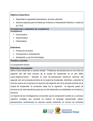 Este proyecto propone el uso de las TIC para mejorar la comprensión lectora de estudiantes de 3°, 4° y 5° grado a través de actividades como la redacción y lectura de cuentos usando procesadores de texto, el análisis e interpretación de videos y textos, y la formulación de preguntas sobre lecturas. Se implementará durante 2 meses con recursos digitales y didácticos, y evaluará el aprendizaje a través de evidencias como fotos y listas de chequeo.