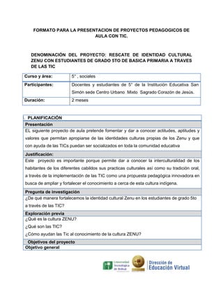 Este proyecto pedagógico busca fortalecer la identidad cultural de la etnia Zenu en estudiantes de quinto grado a través del uso de las TIC. El proyecto tendrá una duración de dos meses e incluirá tres actividades: la presentación de un video sobre la cultura Zenu, la creación de un documento en Word resumiendo el video, y la representación de manifestaciones culturales Zenu en un video. El proyecto utilizará recursos digitales como computadoras e Internet para promover el aprendizaje interactivo sobre la cultura Zenu.