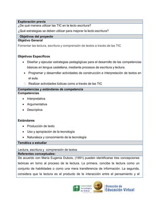 Este documento presenta un proyecto pedagógico para desarrollar las competencias lectoras y escritoras de estudiantes de primer grado a través del uso de las TIC. El proyecto tendrá una duración de dos meses e implementará estrategias que motiven a los estudiantes a mejorar en la lectura y escritura de manera creativa usando recursos digitales. Se proponen tres actividades principales: producción de textos, juegos didácticos y videos educativos.