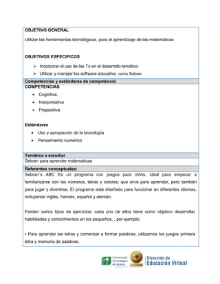 Este proyecto pedagógico utilizará el software educativo Sebran para enseñar matemáticas de manera lúdica a estudiantes de 2o y 3o grado durante 2 meses. Se realizarán dos actividades: la primera explicará qué es Sebran y la segunda consistirá en que los estudiantes completen ejercicios matemáticos usando el software. El objetivo es incorporar las TIC en la enseñanza de las matemáticas para motivar a los estudiantes.