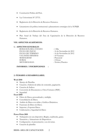 La capacitación de actualización de Microsoft Office (Nivel Intermedio) se llevará a cabo el 16 de noviembre de 2012 por 4 horas en la Universidad Privada San Juan Bautista. Cubrirá temas intermedios de Word, Excel, PowerPoint y Visio sin costo. Está dirigida al personal del laboratorio de cómputo y administrativo de la universidad.
