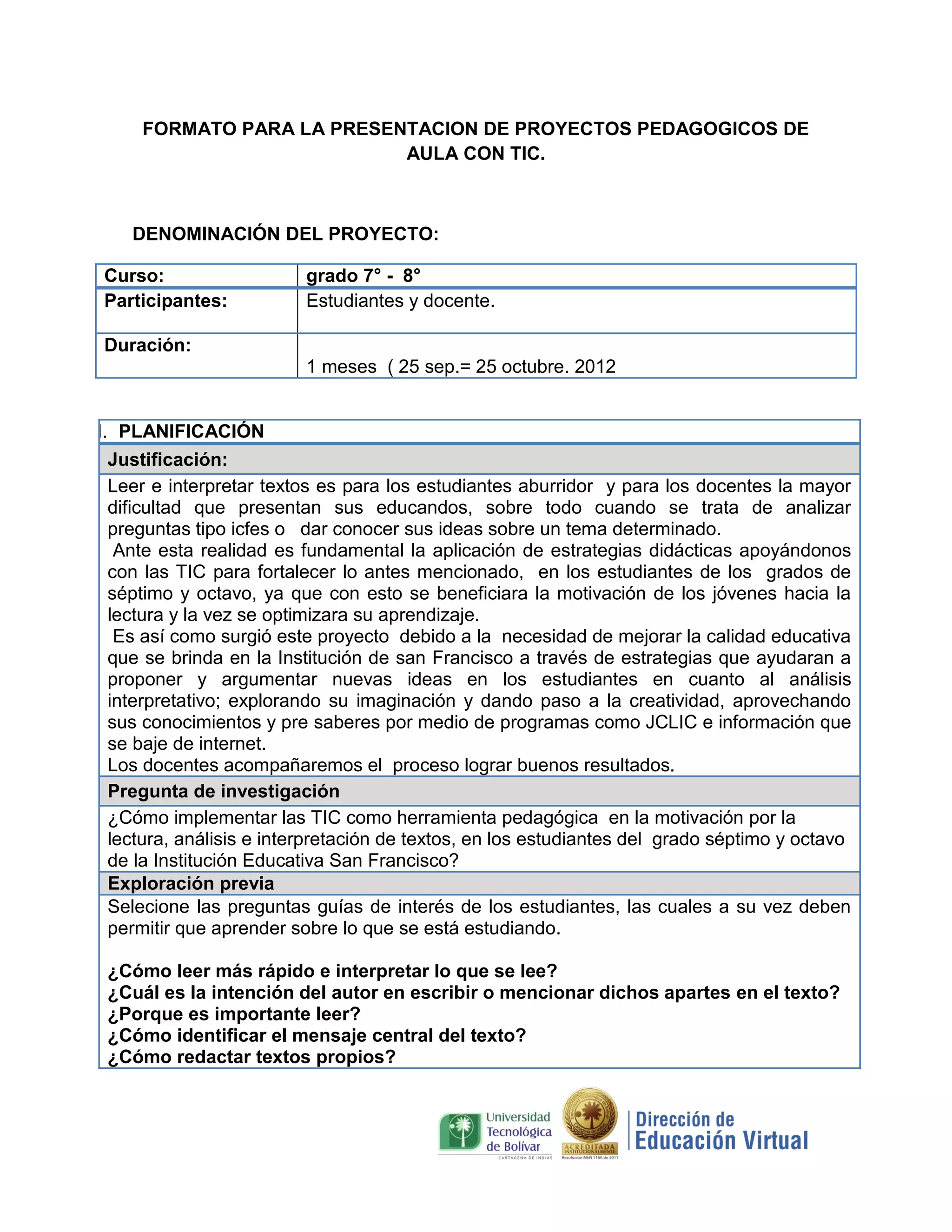Este documento presenta el formato para un proyecto pedagógico que utiliza las TIC para motivar la lectura y el análisis de textos en estudiantes de séptimo y octavo grado. El proyecto se llevará a cabo durante un mes e incluye actividades como leer capítulos de una obra literaria y analizarlos usando herramientas digitales. El objetivo es mejorar las habilidades de comprensión y producción textual de los estudiantes aplicando estrategias didácticas con apoyo de las TIC.