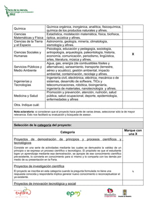 Este documento presenta un formato para la presentación de proyectos de investigación en la Feria de la Ciencia, la Tecnología y la Innovación 2012. El formato solicita información general sobre el proyecto como el título, área temática, categoría e investigadores. Los estudiantes deben diligenciar el formato con datos como el nombre, grado, correo y teléfono de los investigadores principales y coinvestigadores, así como el nombre del docente acompañante. El formato permite anexar material adicional para fortalecer la propuesta del pro