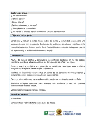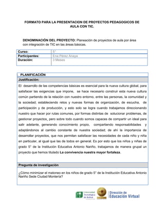 Este documento presenta un proyecto pedagógico para integrar las TIC en las áreas básicas con estudiantes de 5° grado. El proyecto busca minimizar el matoneo a través de actividades como talleres, mesas redondas, compartir espacios fuera del aula, y elaborar cuentos. Se implementará durante 3 meses con estudiantes y padres de la Institución Educativa Antonio Nariño en Montería, Colombia.