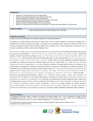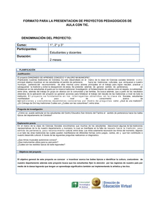 Este proyecto pedagógico tiene como objetivo principal incentivar en los estudiantes el sentido de pertenencia hacia las tradiciones culturales del municipio de Ciénaga de Oro en Córdoba, Colombia a través de actividades como talleres, videos y presentaciones sobre los bailes típicos, instrumentos musicales y vestimenta de la región. Se implementará durante dos meses con estudiantes y docentes utilizando recursos como computadores, videos y materiales sobre las tradiciones locales.