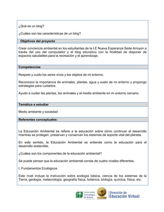 Este documento presenta un proyecto pedagógico para integrar las TIC en el área de medio ambiente en un grado 6. El proyecto busca crear conciencia ambiental a través del uso de computadores y blogs. Las actividades incluyen visitas al entorno para recolectar información, construir un blog para compartir el proyecto, y evaluar los resultados.