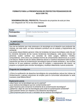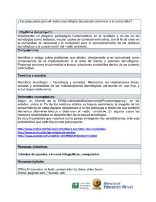 Este proyecto propone reciclar tecnologías desechadas como teclados, mouse y cables para crear nuevos productos. Los estudiantes recolectarán estas tecnologías, las clasificarán y elaborarán productos con ellas para crear conciencia sobre la contaminación tecnológica y promover el cuidado ambiental. El proyecto se implementará durante 3 meses en el colegio Laureano José Mestra Mora.