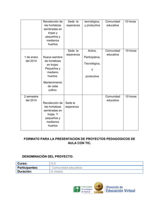Este documento presenta un cronograma de actividades para un proyecto de huerta escolar a realizarse durante 6 meses. El cronograma detalla las actividades que se llevarán a cabo mes a mes, como la organización de grupos, capacitaciones, siembra y mantenimiento de cultivos, y recolección de hortalizas. El proyecto busca crear conciencia sobre la importancia de la agricultura y el cuidado del medio ambiente aplicando metodologías activas y participativas.