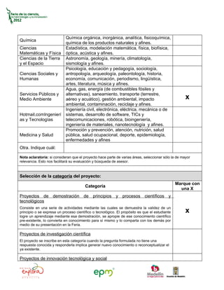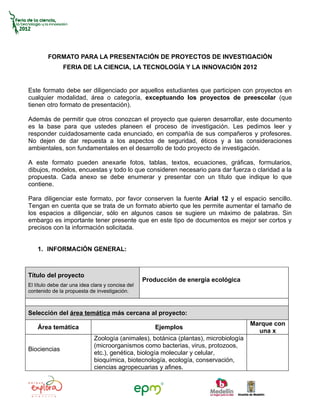 Este documento presenta un formato para que estudiantes presenten proyectos de investigación en la Feria de la Ciencia, la Tecnología y la Innovación 2012. El formato solicita información general sobre el proyecto como el título, área temática, categoría e investigadores. También pide una descripción del proyecto, planteamiento del problema, objetivos, y marco teórico. El formato busca permitir que otros conozcan el proyecto y servir de guía para su planificación e investigación.