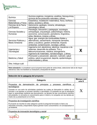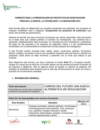 Este documento presenta un formato para que estudiantes diligencien la información de sus proyectos de investigación que participarán en la Feria de la Ciencia, la Tecnología y la Innovación del 2012. El formato solicita detalles sobre el título, área temática, categoría, investigadores, docentes acompañantes, institución educativa y descripción general del proyecto, incluyendo resumen, planteamiento del problema, objetivos y marco teórico.
