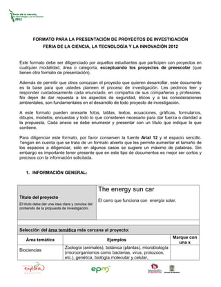 Este documento proporciona un formato para que los estudiantes presenten proyectos de investigación en la Feria de la Ciencia, la Tecnología y la Innovación de 2012. El formato solicita información general sobre el proyecto como el título, área temática, categoría e investigadores. Además, pide detalles sobre los objetivos e hipótesis del proyecto, metodología, cronograma y presupuesto. El formato busca que los estudiantes planifiquen cuidadosamente su proyecto de investigación y puedan presentarlo de