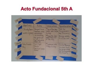 El documento presenta la información del curso de 5to año básico de una escuela, incluyendo la presentación del profesor, objetivos del curso, estructura organizacional, profesores, metodología, evaluaciones, y horarios de entrevistas.