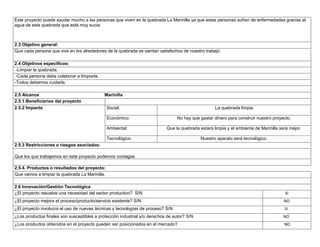 Este proyecto busca limpiar la quebrada La Marinilla en el municipio de Marinilla, Antioquia, Colombia. Actualmente la quebrada está contaminada con residuos tóxicos que afectan la salud de las personas que viven cerca. El proyecto tiene como objetivos limpiar la quebrada, promover la colaboración de la comunidad para mantenerla limpia y cuidar el medio ambiente. El proyecto beneficiaría social, ambiental y económicamente a la población local al mejorar las condiciones sanitarias y del entorno