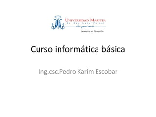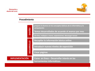 Este documento presenta el diseño de un curso básico de informática. El curso pretende preparar a los alumnos en conceptos básicos de computación e informática a través de temas desarrollados mensualmente utilizando recursos en línea, trabajos manuales y exposiciones. El curso se implementará en línea para fomentar el interés en herramientas informáticas y cubrirá temas como hardware, software, sistemas operativos e Internet.