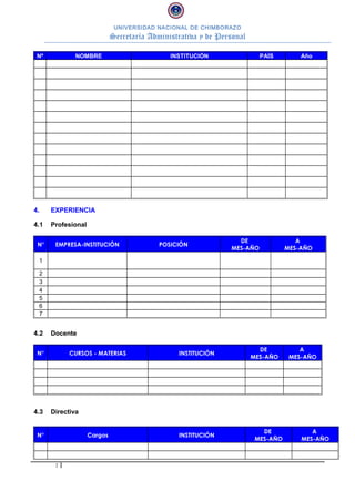 Este documento es una hoja de vida que contiene información personal, formación académica, cursos y seminarios recibidos, experiencia profesional en diferentes áreas como docente, directivo, capacitador e investigador, publicaciones, idiomas y áreas de colaboración potencial de un candidato para un puesto en la Universidad Nacional de Chimborazo. El candidato proporciona sus datos personales y laborales, así como una declaración donde se responsabiliza de la veracidad de la información presentada.