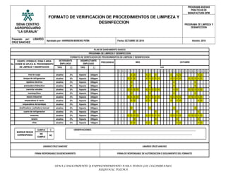 Este documento presenta un formato de verificación de procedimientos de limpieza y desinfección utilizado por el SENA Centro Agrícola "La Granja". El formato lista los equipos, utensilios, zonas y áreas donde se aplican los procedimientos de limpieza y desinfección, así como los detergentes y desinfectantes empleados en octubre. El responsable, Libardo Cruz Sánchez, verifica que se cumplieron correctamente los procedimientos de limpieza y desinfección indicados.