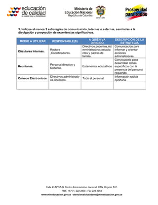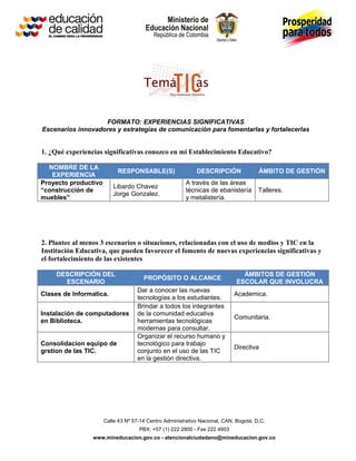 El documento presenta un formato para describir experiencias significativas en un establecimiento educativo, incluyendo un proyecto productivo de construcción de muebles. Propone tres escenarios para fomentar experiencias a través de las TIC, como clases de informática y computadores en la biblioteca. También indica tres estrategias de comunicación interna como circulares, reuniones y correos electrónicos.
